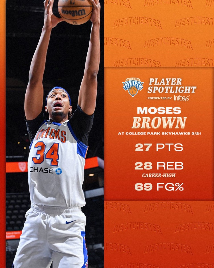 3月22日訊 今天結束的一場(chǎng)發(fā)展聯(lián)盟比賽,韋斯特切斯特尼克斯130比125擊敗大學(xué)公園天鷹。韋斯特徹斯特尼克斯中鋒摩西-布朗此役打出精彩表現,出戰37分鐘,13投9中,12罰7中,砍下27分28籃板。
