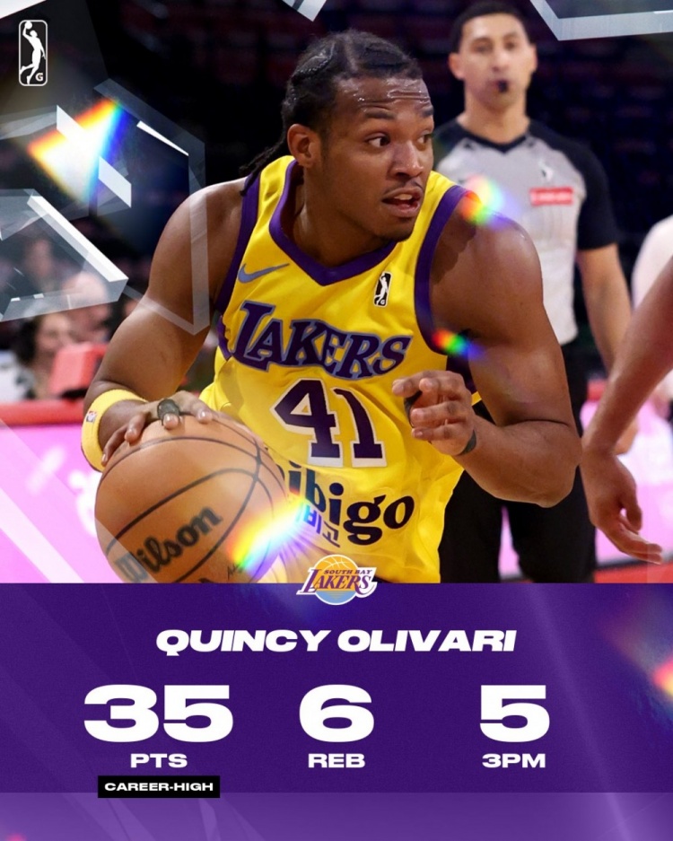 3月22日訊 在今天結束的一場(chǎng)G聯(lián)盟比賽中,南灣湖人113-117不敵蘇福爾斯天力。此役,南灣湖人后衛奧利瓦里在進(jìn)攻端火力全開(kāi),他出戰36分鐘,19投9中,三分11投5中,罰球9罰全中,砍下35分6籃