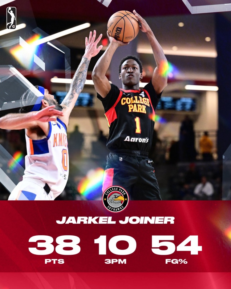 3月22日訊 今天結束的一場(chǎng)發(fā)展聯(lián)盟比賽,大學(xué)公園天鷹125比130不敵韋斯特切斯特尼克斯。不過(guò)大學(xué)公園天鷹后衛、23年落選秀賈克爾-喬伊納打出精彩表現,他替補出戰27分鐘,26投14中,三分16投1