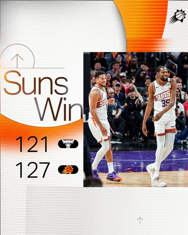 3月20日訊 NBA常規賽,太陽(yáng)127-121擊敗公牛。賽后,太陽(yáng)官方曬出本場(chǎng)贏(yíng)球海報,本場(chǎng)發(fā)揮出色的核心杜蘭特和布克登上封面。本場(chǎng)比賽,杜蘭特繼續穩定輸出,他打了36分8秒,15投8中(三分7中3)