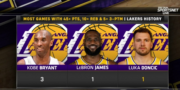 單場(chǎng)45分10板&命中5+三分!東契奇成湖人隊史科詹后第三人