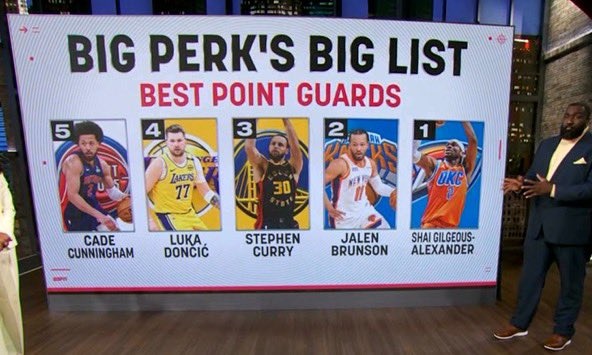 帕金斯列聯(lián)盟目前前5控衛:SGA、布倫森、庫里、東契奇、CC