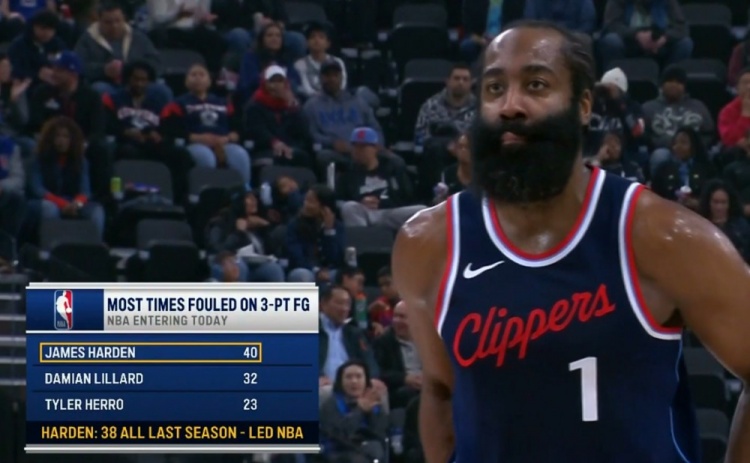 外線(xiàn)殺傷力十足!哈登本場(chǎng)之前40次三分被犯規領(lǐng)跑聯(lián)盟