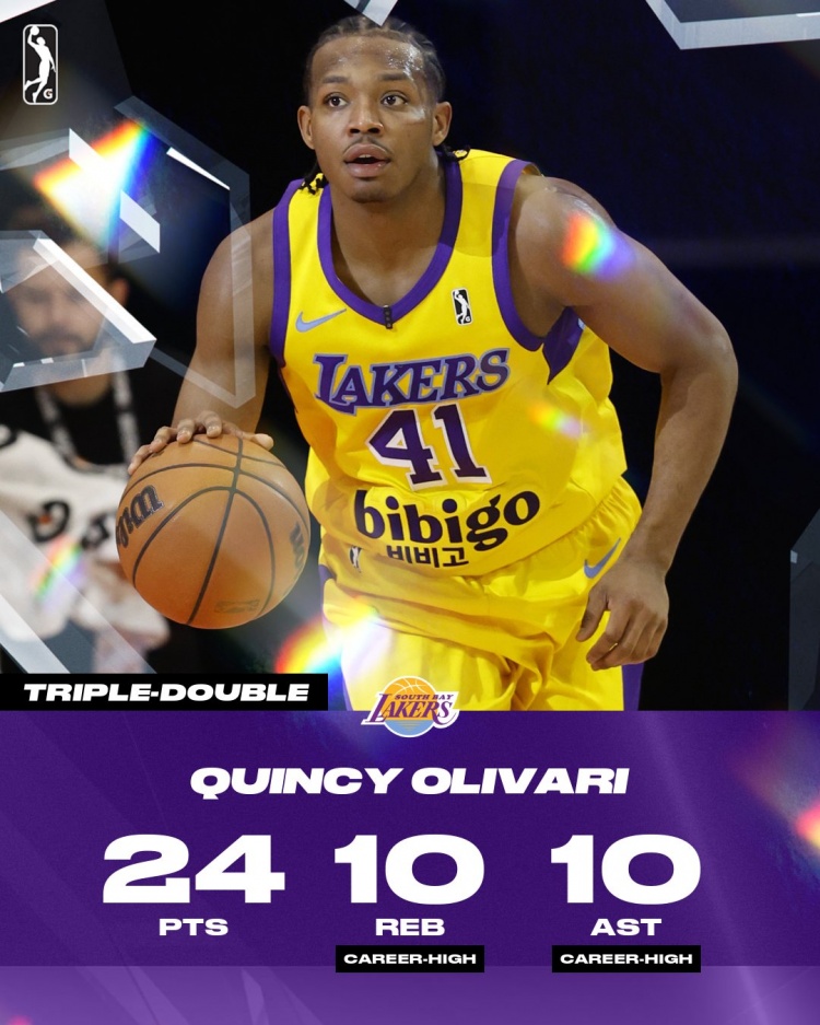 3月4日訊 昨日NBA G聯(lián)盟南灣湖人120-105輕取圣地亞哥快船。南灣湖人球員奧利瓦里表現亮眼拿下生涯首個(gè)三雙,他全場(chǎng)出戰38分鐘,13投6中,三分11投4中,罰球3中3,拿下24分10籃板10助