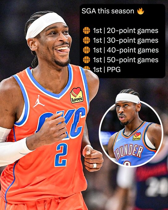 MVP!亞歷山大本賽季第4次轟下50+ 聯(lián)盟其余人最多1次