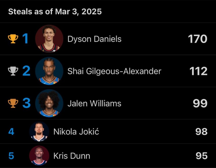 本賽季總搶斷數前5:丹尼爾斯170次遙遙領(lǐng)先 SGA第2 約基奇第4