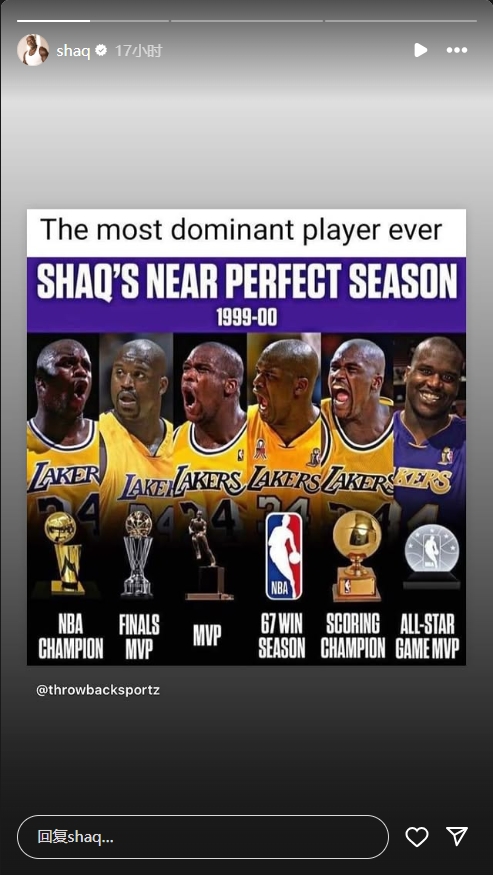 02月28日訊 今日,奧尼爾更新社媒曬出了歷史最具統治力的單賽季表現。1999-2000賽季的奧尼爾自己,他一人囊括5項大獎(總冠軍、總決賽MVP、常規賽MVP、得分王、全明星MVP)+單賽季67勝。