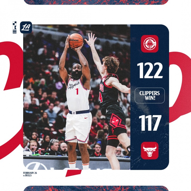 復仇公牛結束三連??!快船戰績(jì)來(lái)到32勝26負 排名西部第6
