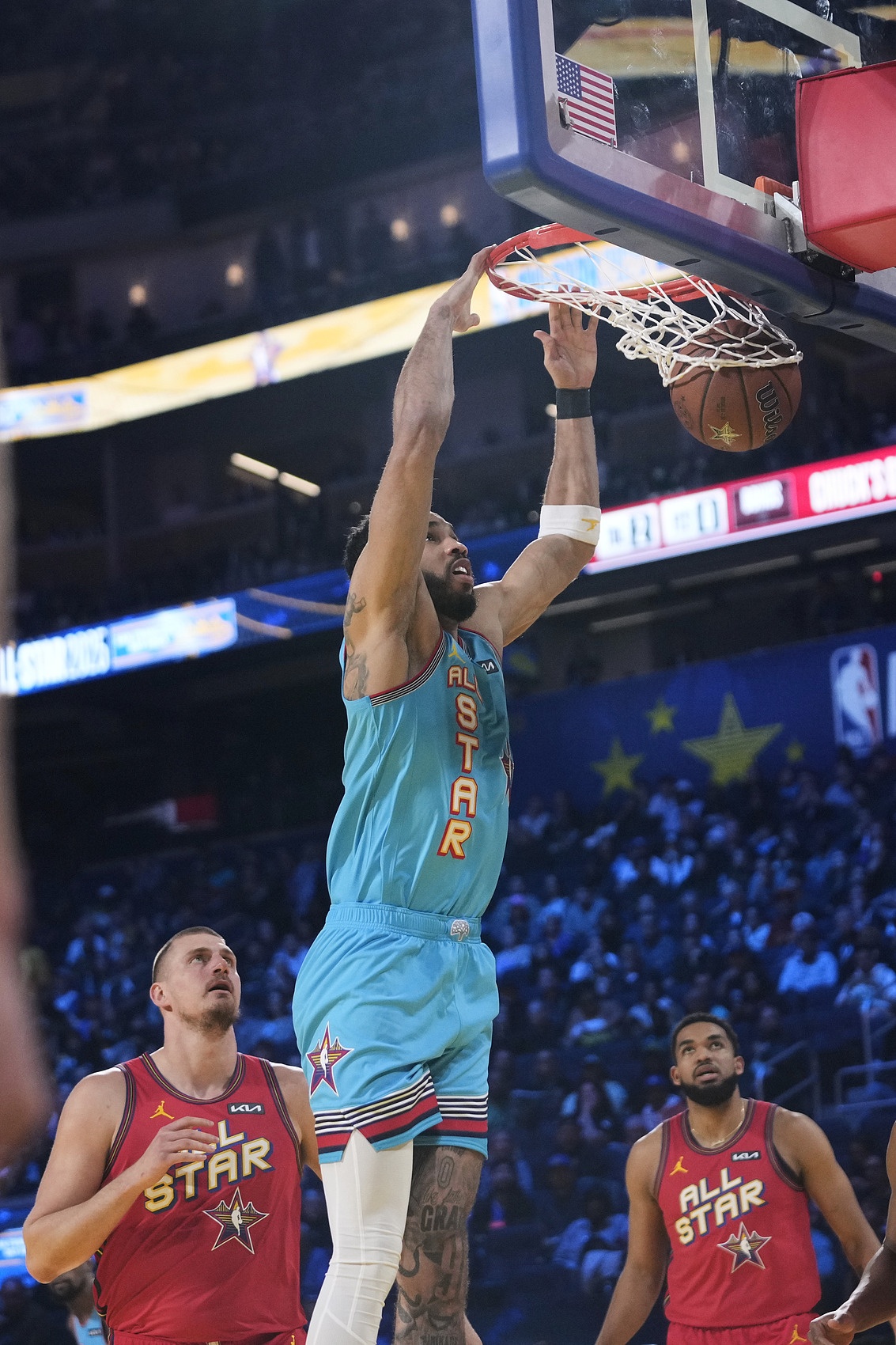 2月17日訊 NBA全明星正賽決賽,奧尼爾隊41-25戰勝巴克利隊。本場(chǎng)比賽,奧尼爾隊球星塔圖姆表現出色,進(jìn)攻十分高效,并打進(jìn)決勝扣籃,11分鐘的時(shí)間里,投籃7中6,三分球4中3,拿到15分4籃板2助