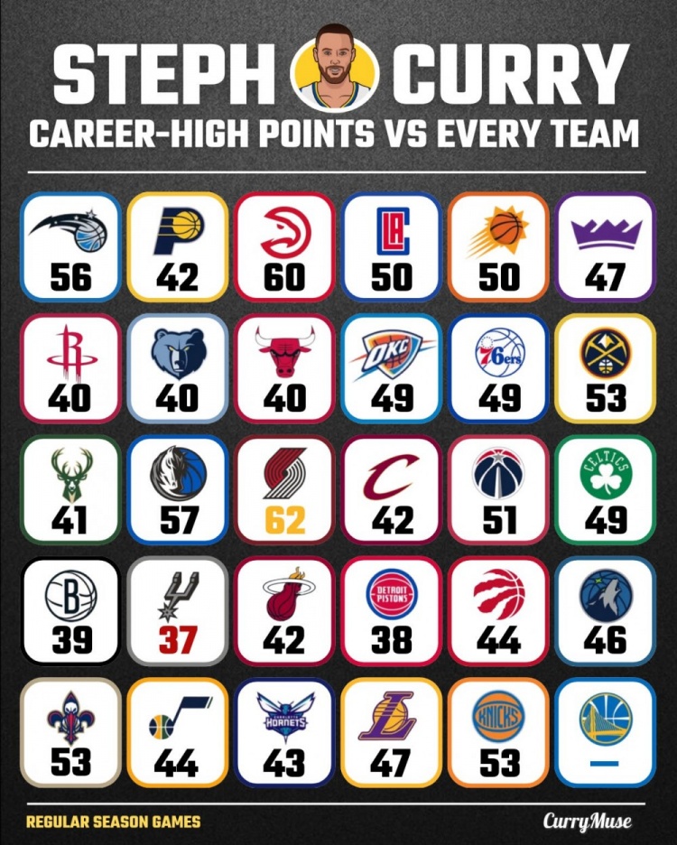 庫里對陣29隊最高分:9隊被掄下50+ 開(kāi)拓者成最大受害者