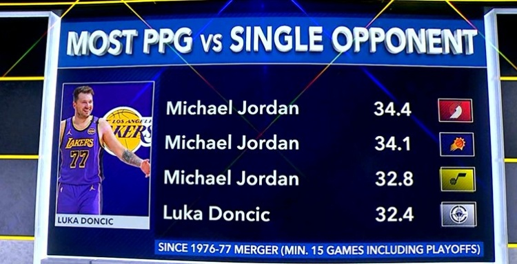 NBA合并以來(lái)球員VS球隊場(chǎng)均得分榜:?jiǎn)痰ぐ园袂? 東契奇對快船第4