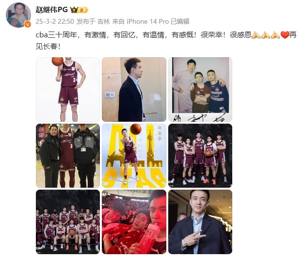 趙繼偉曬照并寫(xiě)道:“cba三十周年,有激情,有回憶,有溫情,有感慨!很榮幸!很感恩????????再見(jiàn)長(cháng)春! ???”