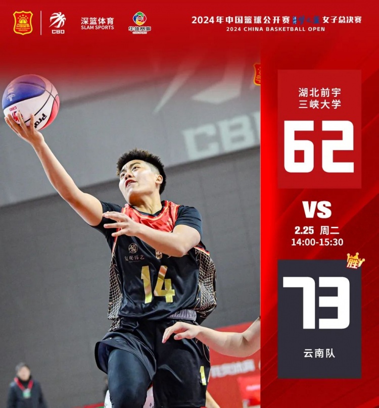 首場(chǎng)比賽由湖北前宇三峽大學(xué)對陣云南隊,上半場(chǎng)開(kāi)局,兩隊打得相對膠著(zhù),比分緊咬至6平。隨后湖北前宇三峽大學(xué)加強防守,8號漆采籃下強勢,反擊中4號衛香羽、5號陸婷接連籃下得分,湖北前宇三峽大學(xué)16-9領(lǐng)先。落后的云南隊,不斷通過(guò)外線(xiàn)尋找機會(huì ),14號娜漢三分命中,幫助球隊逐漸追平并反超比分。首節結束,云南隊22-20領(lǐng)先湖北前宇三峽大學(xué)。次節,兩隊進(jìn)攻火力不減,湖北前宇三峽大學(xué)5號陸婷依舊手感火熱,云南隊14號娜漢也不甘示弱。半場(chǎng)結束,云南隊39-37領(lǐng)先湖北前宇三峽大學(xué)。下半場(chǎng),隨著(zhù)體力的下降,兩隊進(jìn)攻成功率都所有降低,湖北前宇三峽大學(xué)陷入短暫的得分荒,反觀(guān)云南隊在14號娜漢、6號羅菲的帶領(lǐng)下,多次反擊快攻得手,最終云南隊73-62戰勝湖北前宇三峽大學(xué)。
