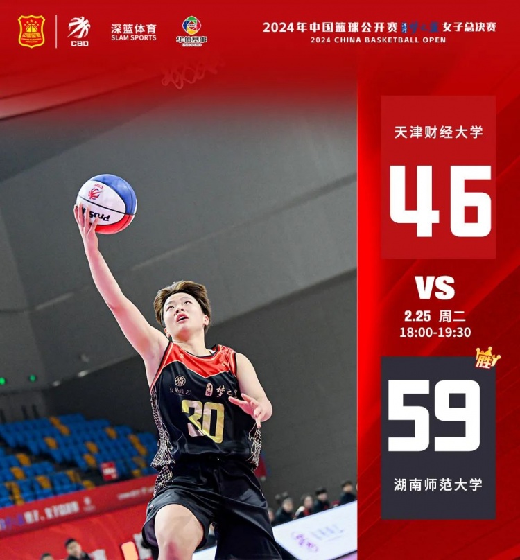 第三場(chǎng)比賽由天津財經(jīng)大學(xué)對陣湖南師范大學(xué),上半場(chǎng)比賽開(kāi)始,兩隊便火藥粉十足,均表現出了強大的防守能力,首節天津財經(jīng)大學(xué)14-15湖南師范大學(xué)。次節,天津財經(jīng)大學(xué)全員手感不佳,湖南師范大學(xué)趁勢打出一波得分的小高潮。半場(chǎng)結束,湖南師范大學(xué)38-22領(lǐng)先天津財經(jīng)大學(xué)。下半場(chǎng),天津財經(jīng)大學(xué)及時(shí)調整,奮起直追。8號夏榮三分命中,天津財經(jīng)大學(xué)追至34-44,湖南師范大學(xué)穩扎穩打,最終湖南師范大學(xué)59-46戰勝天津財經(jīng)大學(xué)。