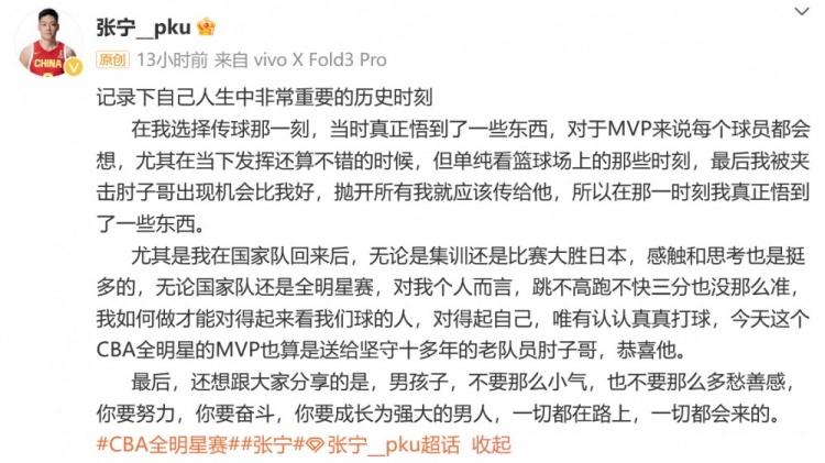 全明星正賽南北區對決時(shí),北區明星隊最終以159比136戰勝南區明星隊,北區中鋒鄒雨宸砍下23分,獲得全明星賽MVP。值得一提的是,張寧在比賽末節時(shí)刻面對夾擊,并沒(méi)有選擇“單打刷分”,而是傳球給了鄒雨宸,助力鄒雨宸完成暴扣,進(jìn)而拿下MVP。