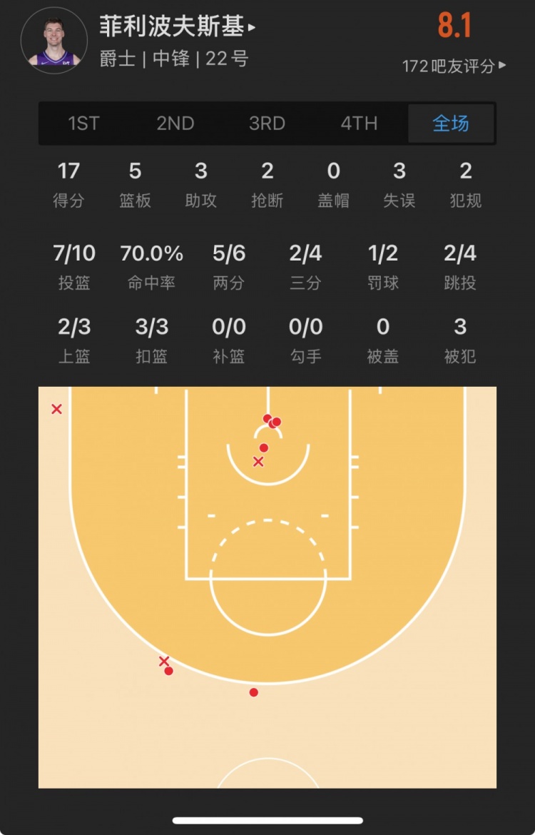 爵士32號秀 凱爾-菲利波夫斯基 登場(chǎng)27.3分鐘