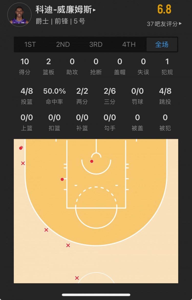 爵士10號秀 科迪-威廉姆斯 登場(chǎng)21.6分鐘