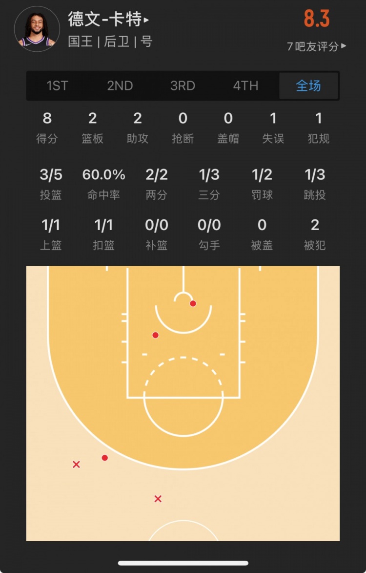 國王13號秀 德文-卡特 登場(chǎng)14.4分鐘
