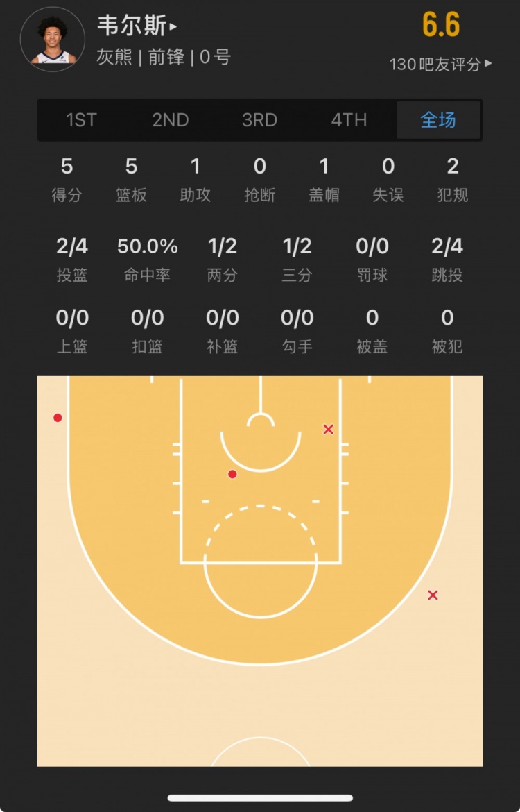 灰熊39號秀 杰倫-韋爾斯 登場(chǎng)21.0分鐘