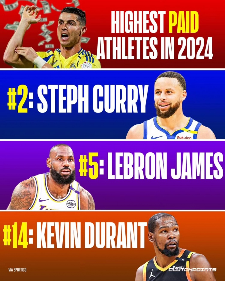 3月10日訊 美媒《Sportico》公布2024年年收入最高的運動(dòng)員排行,其中,庫里第二僅次于C羅,詹姆斯第五,詳情如下: