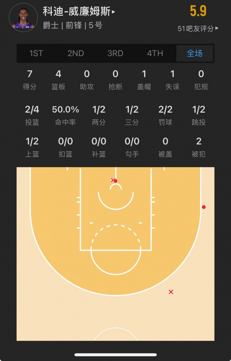 爵士10號秀 科迪-威廉姆斯 登場(chǎng)16.1分鐘
