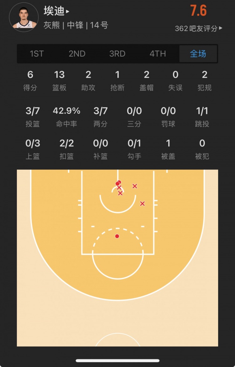 灰熊9號秀 扎克-埃迪 登場(chǎng)22.6分鐘