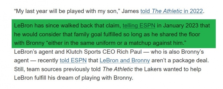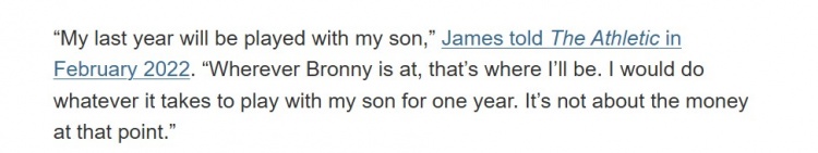 2022年2月,詹姆斯在接受The Athletic采訪(fǎng)時(shí)第一次談到父子同臺的愿望:“我在生涯最后一年會(huì )和我兒子一起打球,無(wú)論布朗尼在哪里,我都會(huì )去那個(gè)地方。我愿意做任何事情來(lái)實(shí)現與我的兒子一起打球一年。屆時(shí)錢(qián)也就不重要了?!?/p>