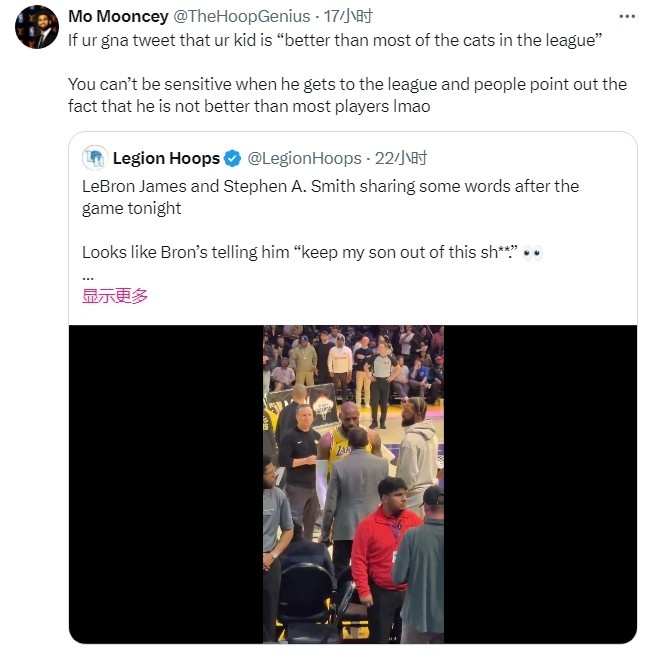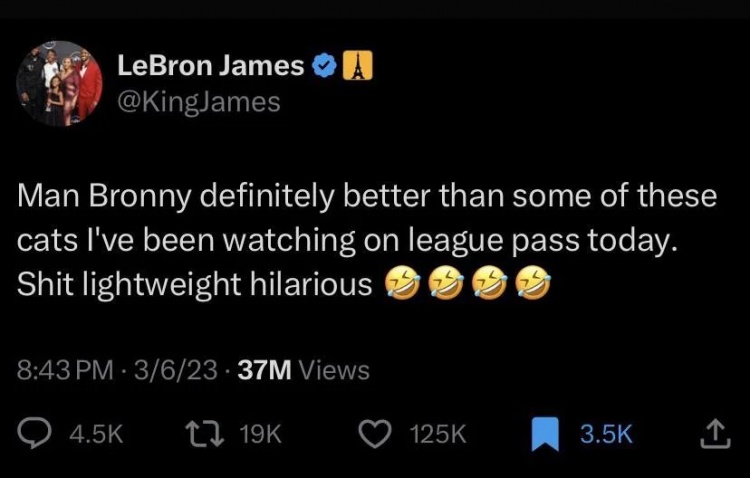 在2023年3月6日,詹姆斯發(fā)推寫(xiě)道:“天啊,布朗尼絕對強于今天我在聯(lián)盟通(注:NBA官方比賽直播服務(wù))上看到的一些阿貓阿狗。這場(chǎng)面真的有點(diǎn)好笑????????????????”
