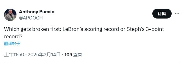 對此,記者Anthony Puccio發(fā)推問(wèn)道:“詹姆斯的得分紀錄和庫里的三分紀錄,哪個(gè)會(huì )先被打破?”