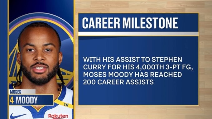 比賽第三節,穆迪助攻庫里命中本場(chǎng)第2記三分,后者正式突破4000記三分神級大關(guān),而這也是穆迪生涯的第200次助攻!