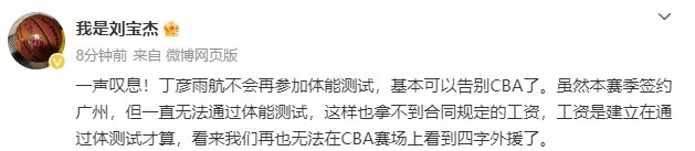 原文寫(xiě)道:“一聲嘆息!丁彥雨航不會(huì )再參加體能測試,基本可以告別CBA了。雖然本賽季簽約廣州,但一直無(wú)法通過(guò)體能測試,這樣也拿不到合同規定的工資,工資是建立在通過(guò)體測試才算,看來(lái)我們再也無(wú)法在CBA賽場(chǎng)上看到四字外援了。 ???”