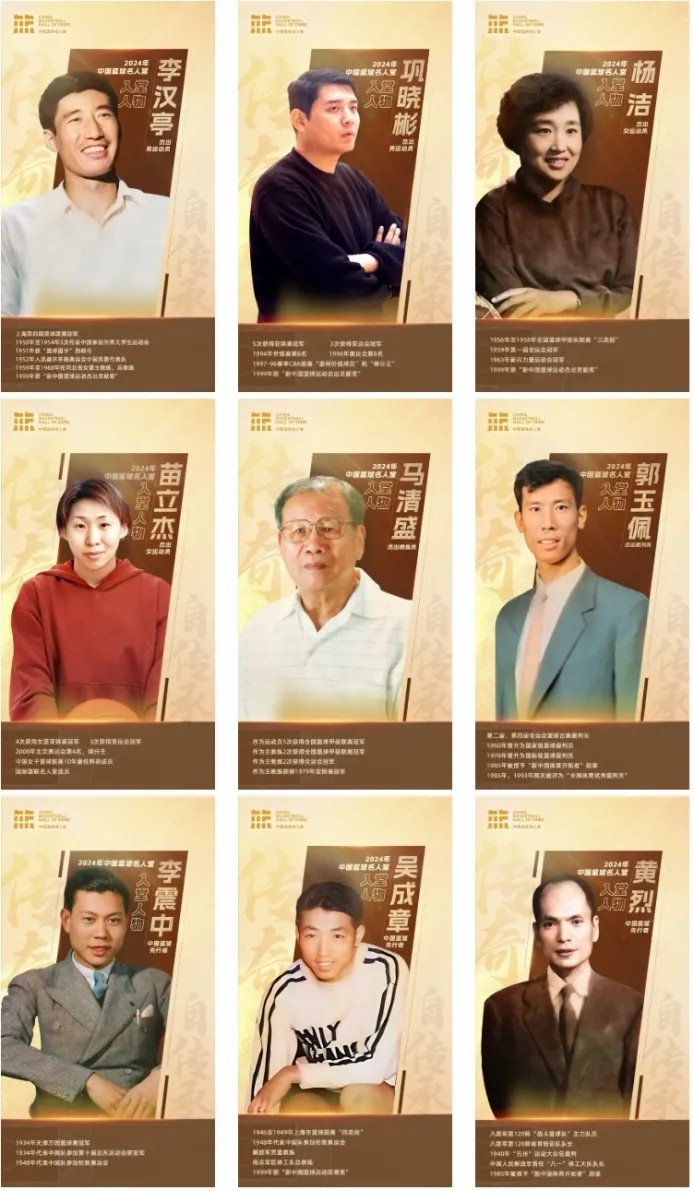 2024年中國籃球名人堂共產(chǎn)生9位入堂人物,杰出男運動(dòng)員為:李漢亭、鞏曉彬;杰出女運動(dòng)員為:楊潔、苗立杰;杰出教練員為:馬清盛;杰出裁判員為:郭玉佩;中國籃球先行者為:李震中、吳成章、黃烈。