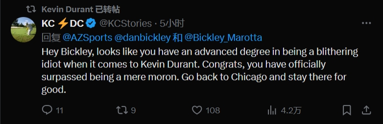 球迷三:嘿,看來(lái)你在"如何成為關(guān)于凱文-杜蘭特的胡說(shuō)八道專(zhuān)家"這方面已經(jīng)獲得了高等學(xué)位。恭喜你,你正式超越了一個(gè)普通的白癡????。趕緊滾回芝加哥,永遠待在那兒吧。