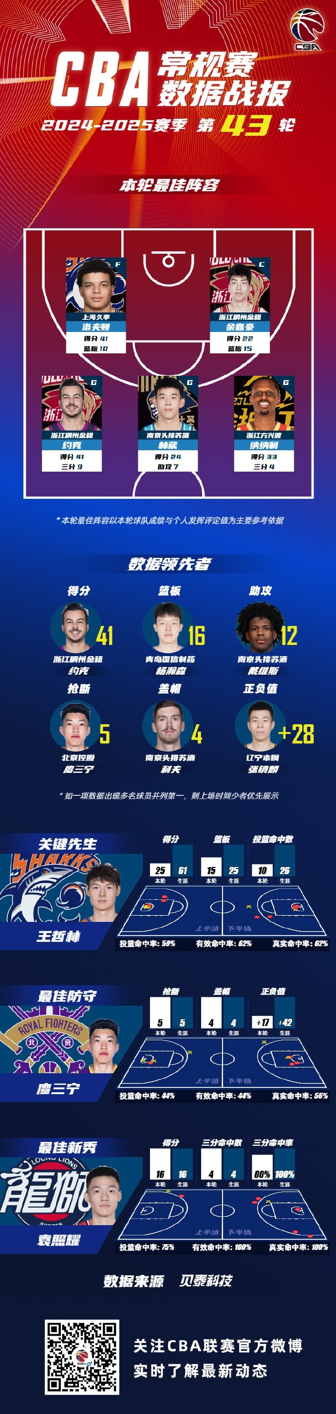 2024-2025賽季CBA聯(lián)賽常規賽第43輪結束較量,來(lái)自上海久事大鯊魚(yú)的洛夫頓,浙江稠州籃球俱樂(lè )部余嘉豪和約克,南京同曦籃球俱樂(lè )部的林葳和浙江廣廈籃球俱樂(lè )部的納納利入選CBA聯(lián)賽常規賽第43輪最佳陣容!