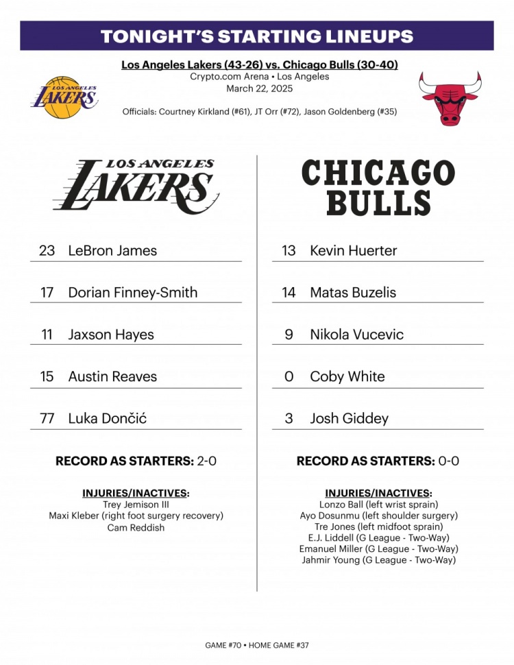 湖人主場(chǎng)戰公牛 雷迪什和雙向合同球員杰米森沒(méi)有進(jìn)入激活名單