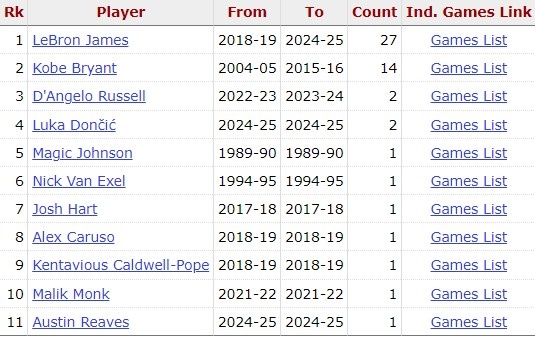 湖人隊史30+5+5+5三分場(chǎng)次:詹姆斯27 科比14 東契奇&拉塞爾2
