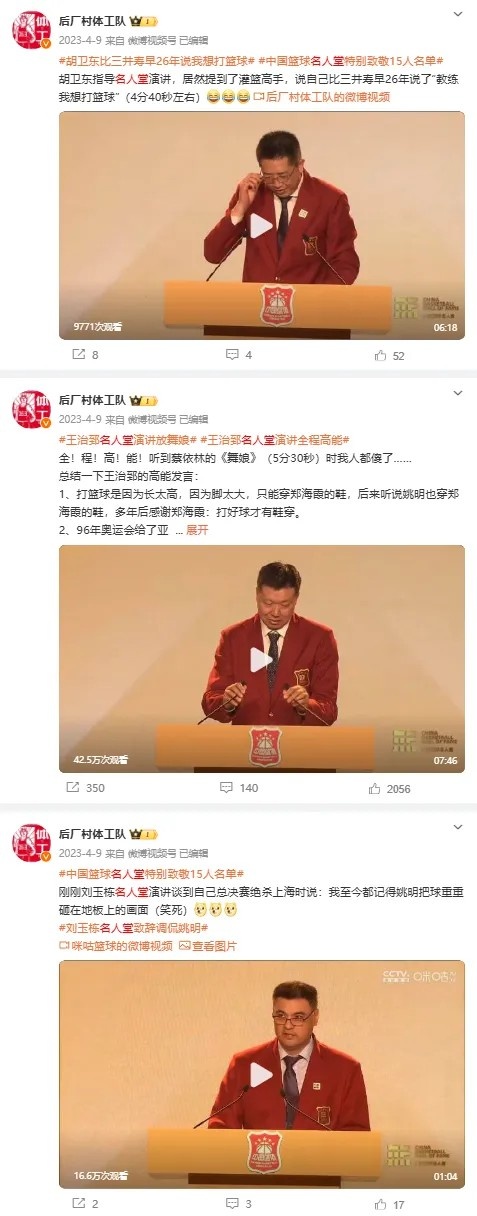 兩年前中國籃球名人堂第一次辦入堂儀式時(shí),我還在老東家為后廠(chǎng)村體工隊玩命,那會(huì )我一邊錄屏搶時(shí)間搶話(huà)題,一邊隔著(zhù)屏幕感受著(zhù)那種“新的文化爭在建立”帶來(lái)的輕松氣氛: