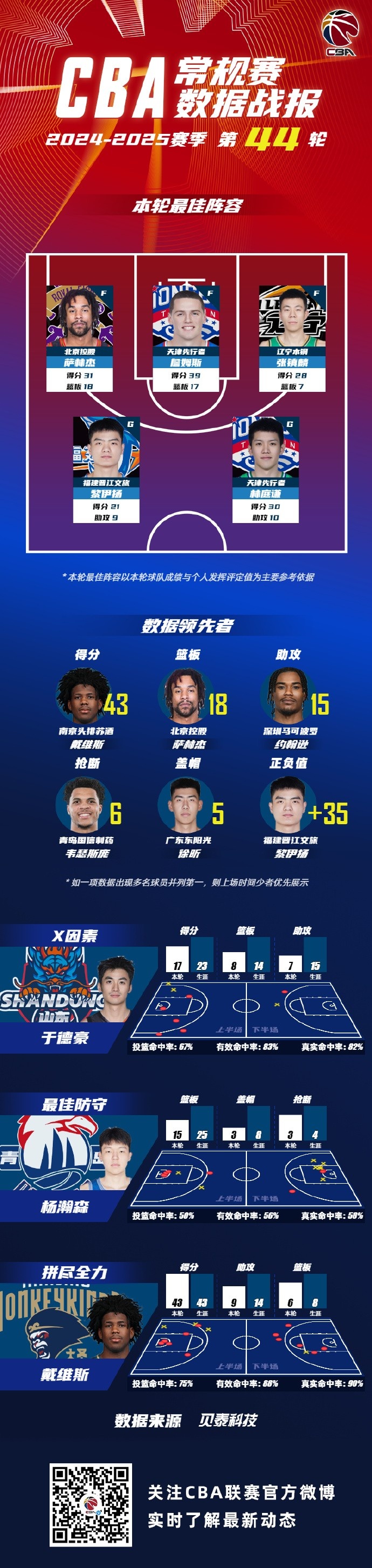 數據領(lǐng)先者方面:南京同曦籃球俱樂(lè )部球員戴維斯以單場(chǎng)43分的數據領(lǐng)銜得分榜;