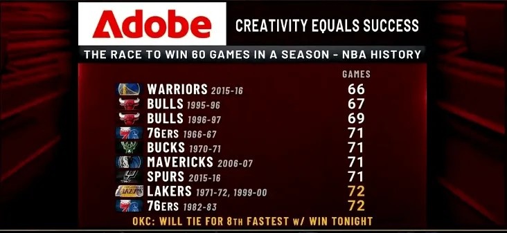 雷霆僅用72場(chǎng)就獲60勝&平NBA歷史第八快 第一快是16年勇士的66場(chǎng)