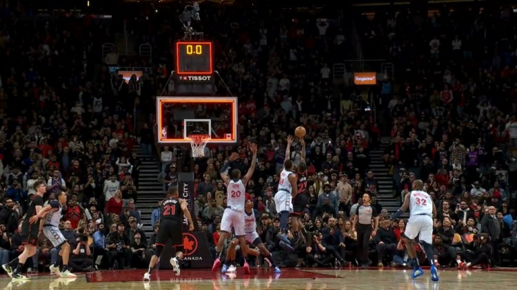 奇才隊垂頭喪氣地站在一旁,希望裁判的審查能取消這個(gè)進(jìn)球。當裁判做出裁決——謝德在時(shí)鐘指向0:00時(shí)仍有兩個(gè)手指觸球——奇才隊高興地跳了起來(lái),猛龍隊從興奮變?yōu)檎痼@,噪音從喧鬧變?yōu)槔Щ蟮牡驼Z(yǔ)。