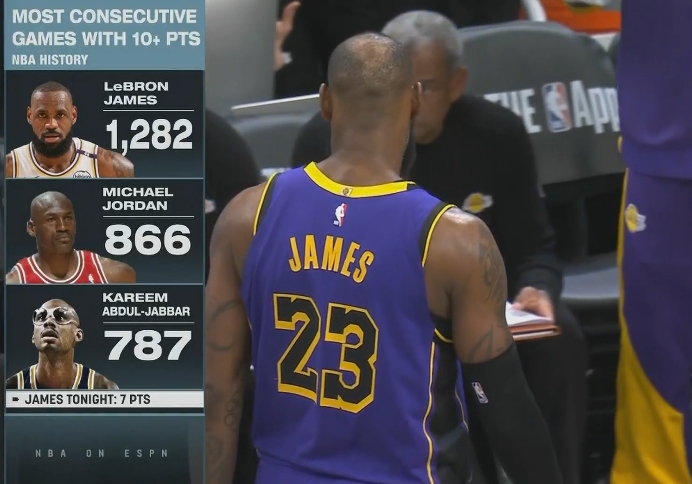 雖遲但到!詹姆斯第四節開(kāi)局連得8分連續1283場(chǎng)比賽得分上雙!