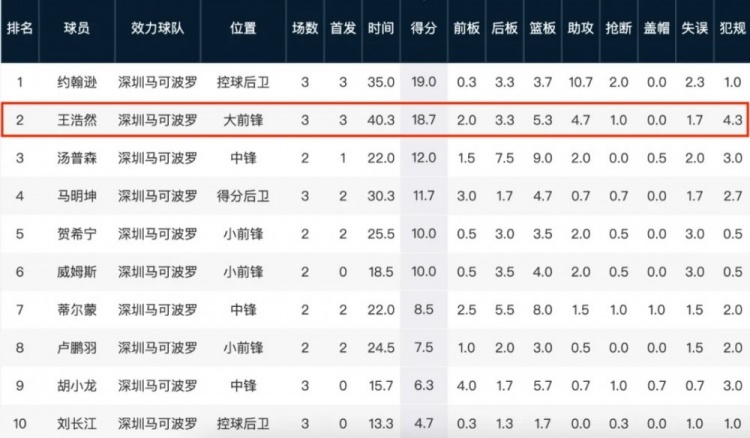 戲份增加的王浩然,產(chǎn)量也無(wú)愧于教練組的信任——他場(chǎng)均18.7分僅次于小外援約翰遜的19分,作為本土隊內得分王的同時(shí),另外也有隊內第4的5.3籃板,和第2的4.7次助攻。