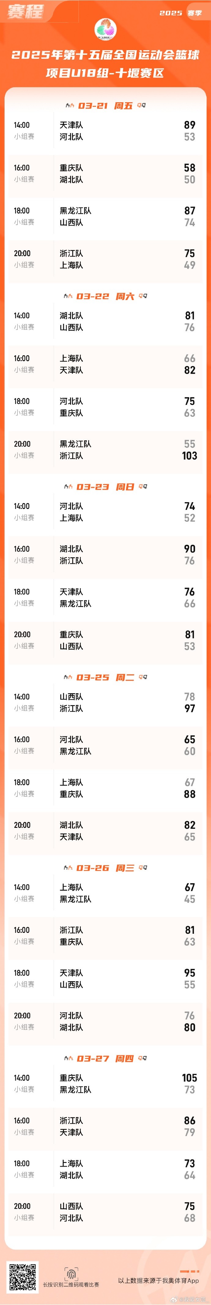 【湖北、重慶、浙江U18女籃挺進(jìn)決賽圈】24場(chǎng)全運會(huì )U18女籃資格賽昨晚在湖北十堰全部落下帷幕,最終湖北、重慶、浙江U18女籃成功突圍,昂首挺進(jìn)“十五運”決賽圈!