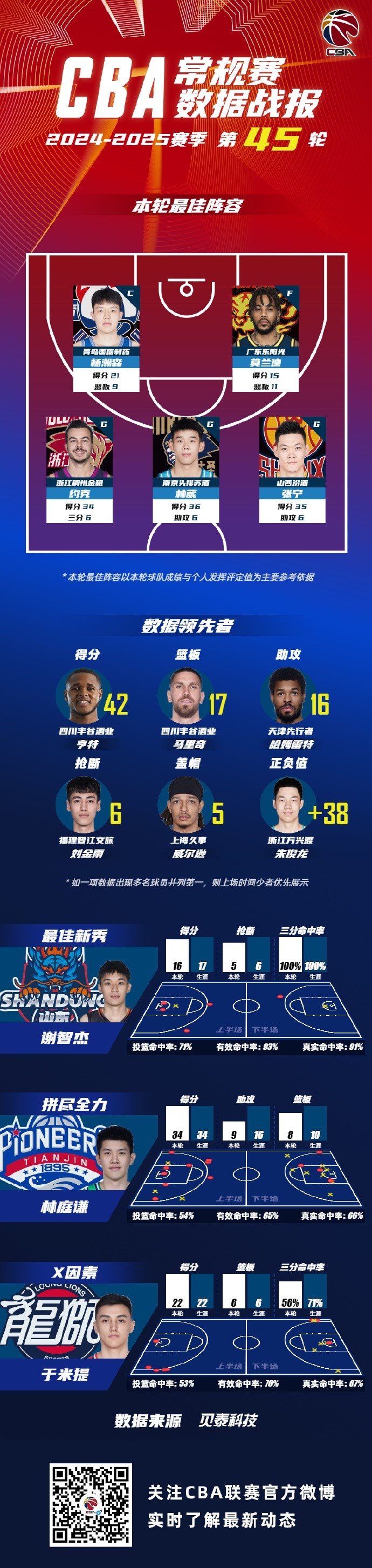 第45輪最佳新秀由來(lái)自山東高速籃球俱樂(lè )部的謝智杰獲得;