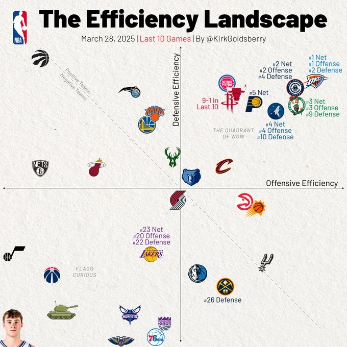 過(guò)去10場(chǎng)攻防:雷霆進(jìn)攻第1 快船凈效率第2 湖人防守第22