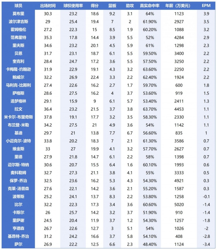 論綜合影響力,具備超強防守影響力的高大內線(xiàn)優(yōu)勢巨大。30位三當家EPM排行榜,莫布里、波爾津吉斯和霍姆格倫分列1-3位,他們所效力的球隊均是本賽季勝率前3位的強隊??紤]到他們3人攻防兼備,這個(gè)結果不讓人意外。
