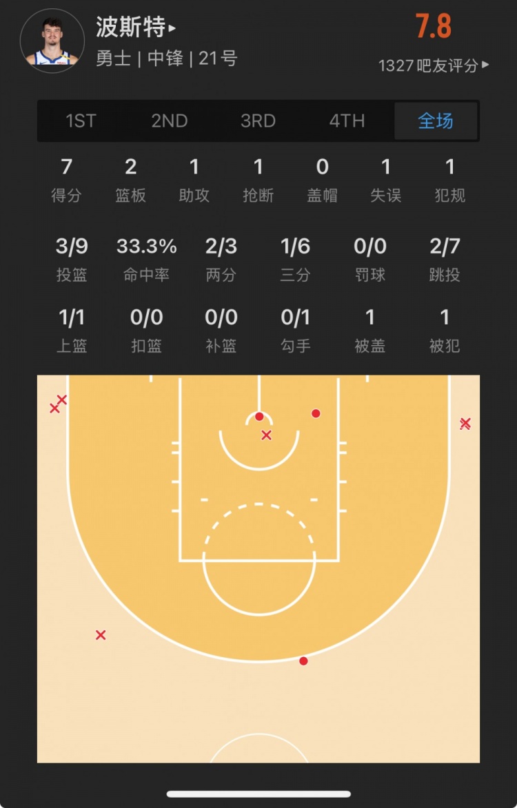 勇士52號秀 昆滕-波斯特 登場(chǎng)17.7分鐘