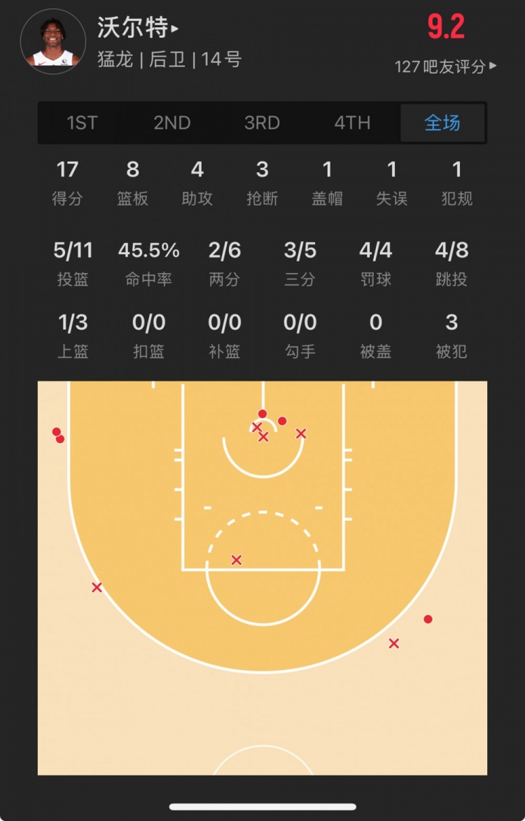 猛龍19號秀 賈科比-沃爾特 登場(chǎng)34.2分鐘