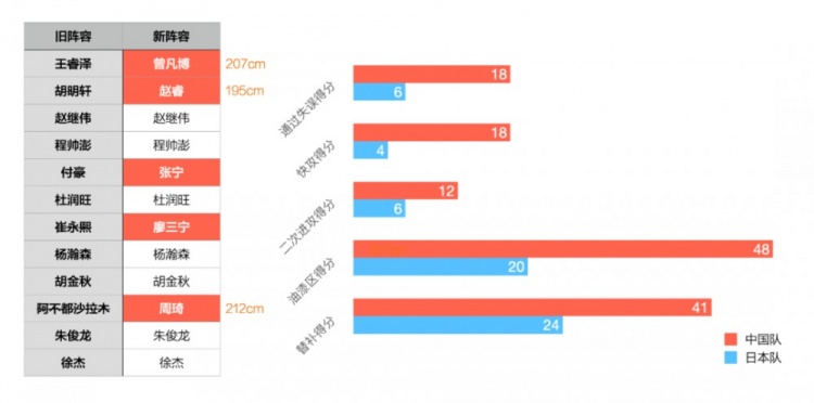 而與上一次亞預賽輸給日本隊相比,這次我們迎來(lái)了趙睿和周琦的回歸,并且多了2米07的高大鋒線(xiàn)曾凡博。正因為有這些能在對位中占據絕對體型優(yōu)勢的球員加入,我們才有了這次42分的大勝。