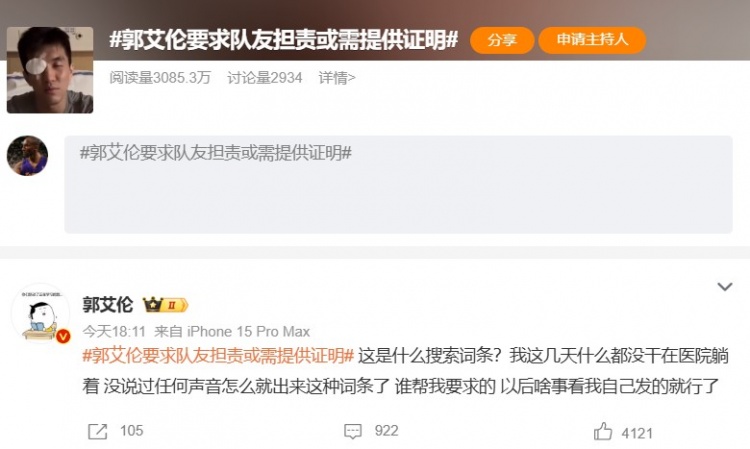 在今日微博熱搜中,出現詞條“郭艾倫要求隊友擔責或需提供證明”。